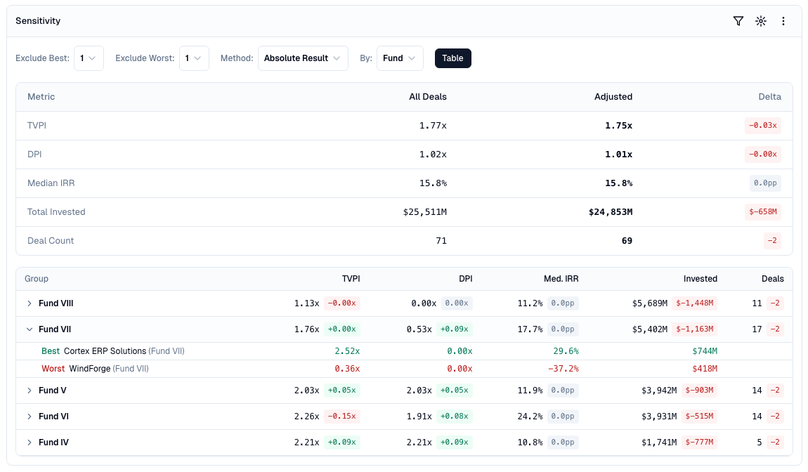 The test is symmetric because you have to remove both tails. Some LPs only strip out the winners to check for home-run dependency. But stripping out the worst losses too gives you the baseline performance of the "middle" of the portfolio - the part that best represents what the GP actually does, repeatedly, on a normal deal.