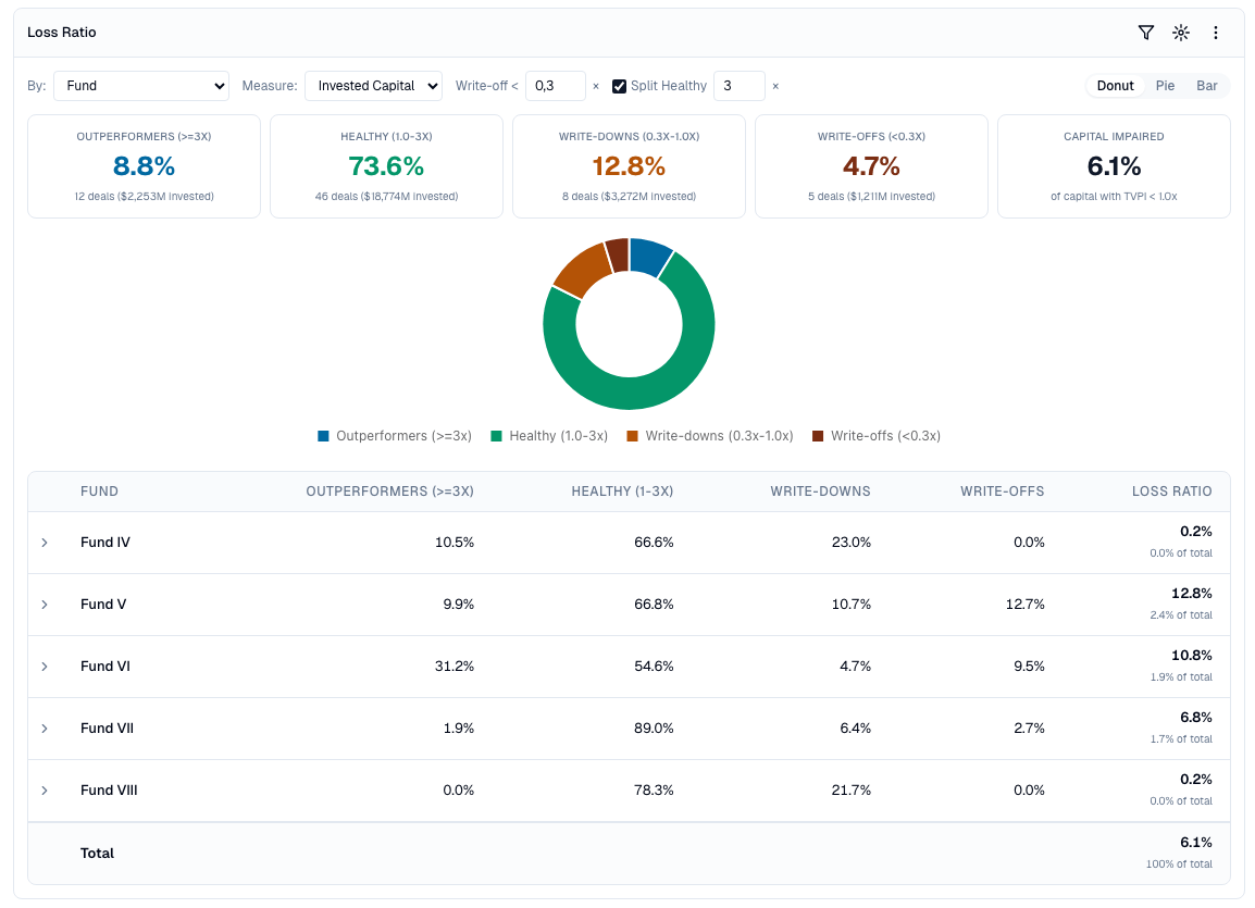 Screenshot from FundFrame Diligence of loss analysis. Summary statistics at the top, split by fund below.